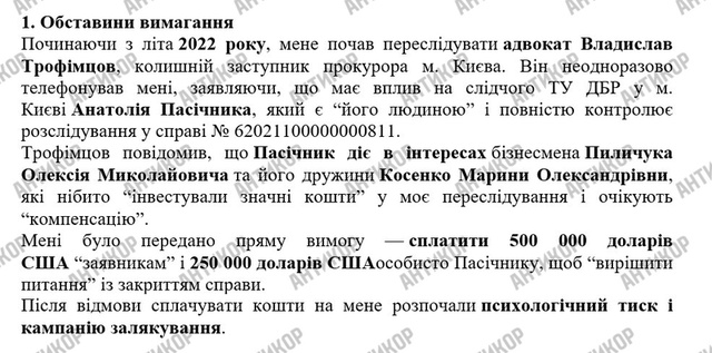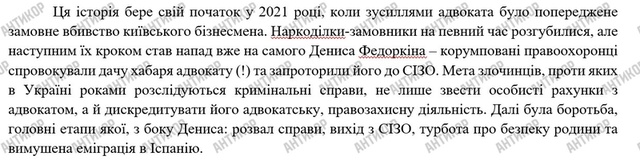 За словами Фкдоркіна, від літа 2022 року йому регулярно надходили вимоги сплатити значні суми коштів – спершу 500 тисяч доларів «заявникам» і ще 250 тисяч слідчому Пасічнику. В іншому епізоді вимоги вже становили 80 тисяч за припинення розшуку та 150 тисяч за закриття справи. Всі ці звернення, як зазначає адвокат, були задокументовані: збереглися записи телефонних розмов, скриншоти листування та інші матеріали, що стали частиною іспанського досьє.