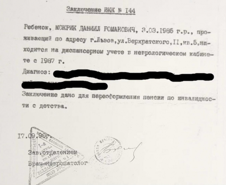«Як пояснив сам Данило, він має якусь відстрочку на підставі радянської довідки 1990 року, коли 5-річною дитиною стояв на диспансерному обліку в невролгічному кабінеті. Старий клаптик паперу, надрукований на машинці. Це і є документ, який надав Мокрик як пояснення, чому він не служить. Ні витяг з «Резерв+», ні копія посвідчення особи з інвалідністю, а радянський папірець 35-річної давнини з трикутним штампом «для довідок» з поліклініки», – прокоментував Ощановський.
