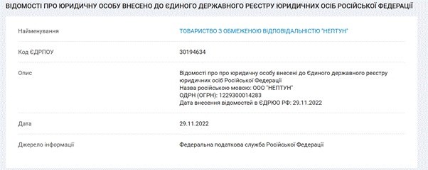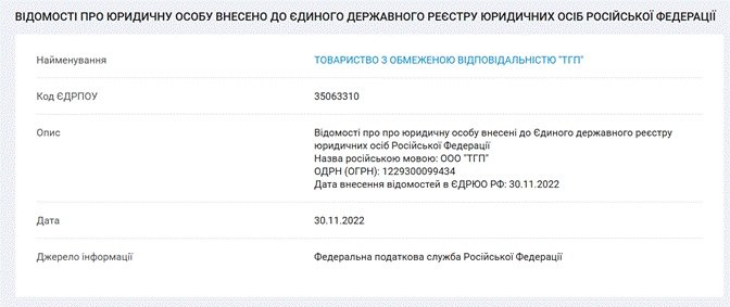 Зокрема, йдеться про ТОВ «ТГП» — за даними реєстрів, компанію, ймовірно, перереєстрували за законодавством країни-агресора у листопаді 2022 року.
