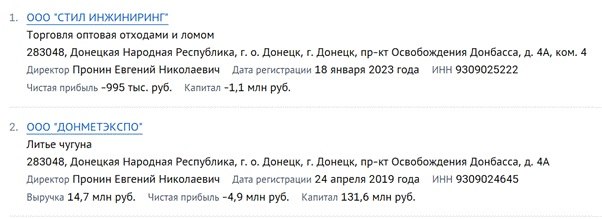 Під час аналізу цих структур, схоже, виявився ще один ймовірний збіг. Йдеться про Проніна Євгена Миколайовича. На нього в Донецьку зареєстровані дві компанії за однією адресою. І це ж ім’я знову з’являється серед бізнес-партнерів Гельзіна.