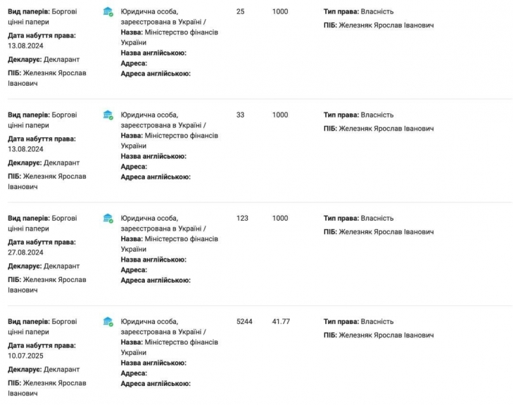 У нардепа Ярослава Железняка журналісти знайшли щонайменше 1,3 млн грн, які той не за декларував. Саме таку суму становить різниця доходами Ярослава Железняка та його витратами на купівлю облігацій Мінфіна на 3,6 млн грн згідно з декларацією за 2025 рік. Про це йдеться у журналістському розслідуванні видання «Інформатор», яке надіслало запит до НАЗК.