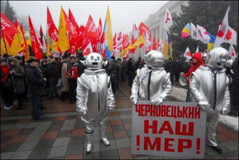 В то же время, по другую сторону улицы Грушевского, собрались около 100 сторонников Черновецкого с требованием отставки министра внутренних дел Юрия Луценко.