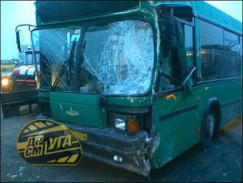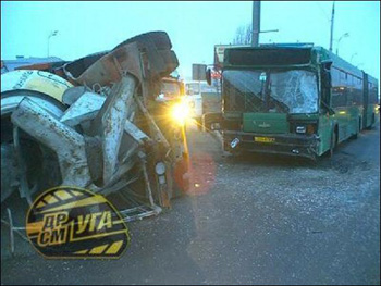 Избежать столкновения водителю автобуса не удалось. От удара бетономешалка перевернулась на левый бок.