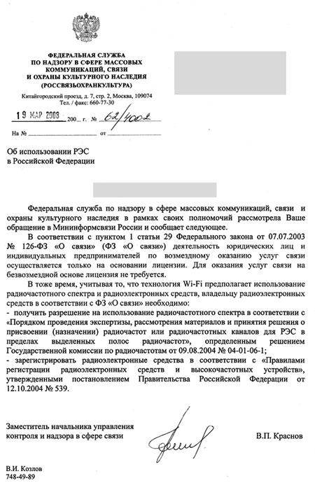 В ответе на соответствующий журналистский заместитель начальника Управления контроля и надзора в сфере связи Владимир Краснов заявил, что владельцу радиоэлектронных средств технологии Wi-Fi необходимо получить разрешениена использование радиочастотного спектра, а также зарегистрировать оборудование.