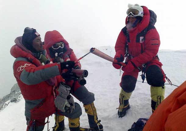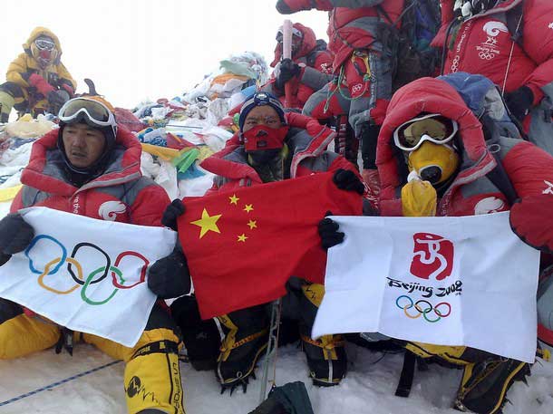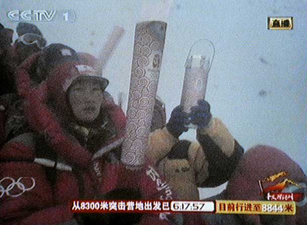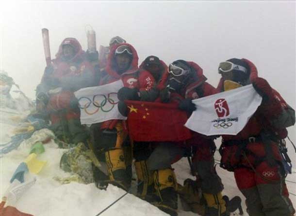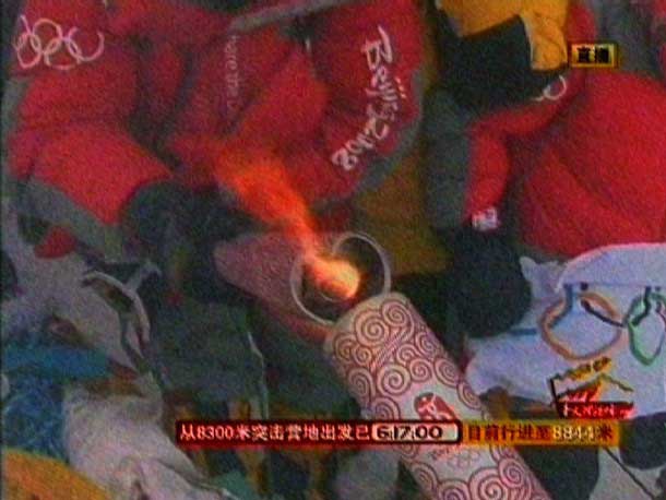 Группа из 19 китайских альпинистов достигла вершины около шести утра по местному времени. Был совершен символический ритуал зажжения факела и проведена 30-метровая эстафета с олимпийским огнем.