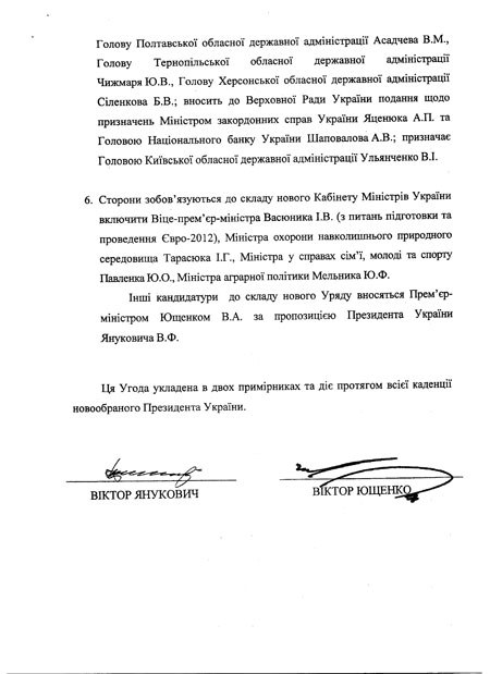 Сегодня, 25 декабря 2009 года, в УНИАН состоялась пресс-конференция, в ходе которой экс-руководитель главной службы по внутриполитическим вопросам и региональному развитию Секретариата президента Украины Козачок Я. В. обнародовал соглашение о взаимодействии Виктора Ющенко и Виктора Януковича, скрепленное их подписями.