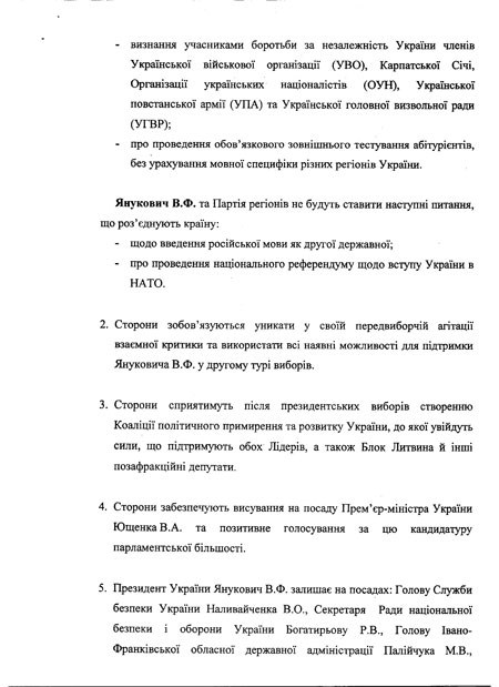 Экс-руководитель главной службы по внутриполитическим вопросам и региональному развитию Секретариата президента Украины Козачок Я. В. обнародовал соглашение о взаимодействии Виктора Ющенко и Виктора Януковича, скрепленное их подписями.