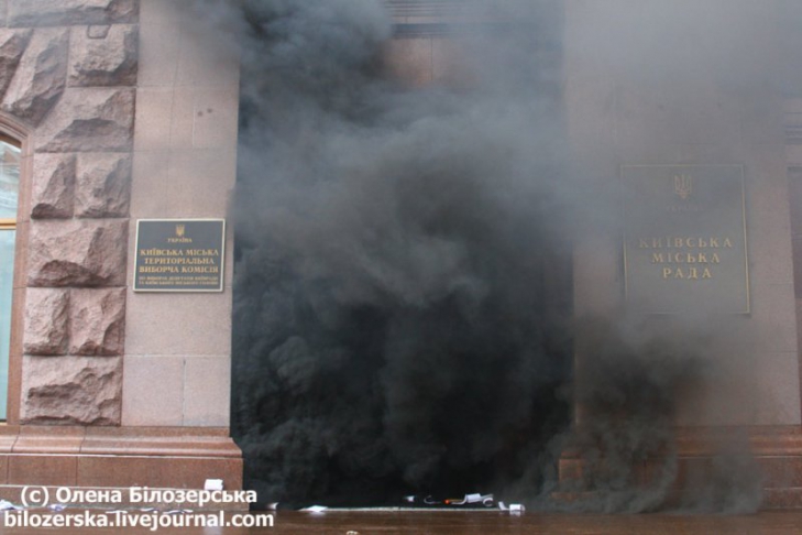 Активисты забили гвоздь в дверь КГГА, после чего забросали здание дымовыми шашками.