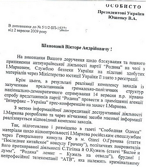 Игорь Марков на пресс-конференции также показал журналистам переписку главы Службы безопасности Украины (СБУ) с Виктором Ющенко, в которой Валентин Наливайченко сообщал о проделанной работе по дискредитации лидера «Родины» и информационной кампании с целью обвинить партию в «антигосударственной деятельности». Также Марков продемонстрировал письмо руководителя СБУ в Минюст с требованием прекратить деятельность «Родины».