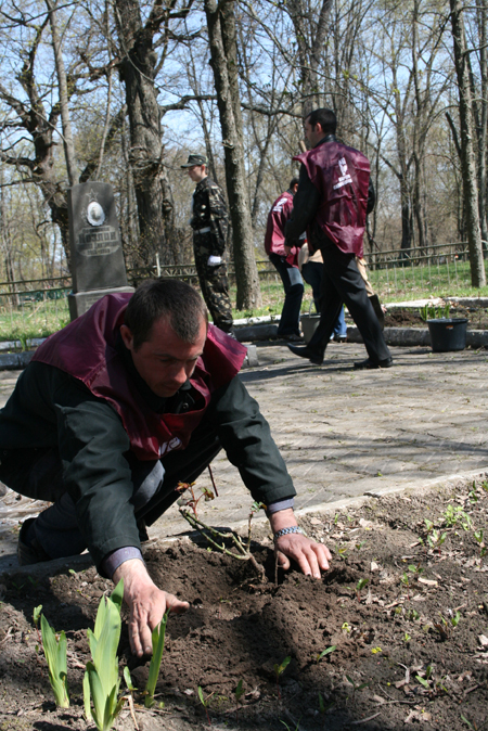 «В прошедшую субботу акция стартовала в центре городка Рипки, где накануне 24-й годовщины аварии на Чернобыльской АЭС «самооборонцы» в память о ликвидаторах высадили розы. Чернобыльская трагедия коснулась здесь многих: 500 жителей Рипок участвовали в ликвидации аварии, а 100 ликвидаторов заплатили собственной жизнью, чтобы защитить от беды миллионы украинцев.