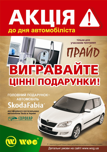 Грандиозный розыгрыш призов готовит ко дню автомобилиста сеть автозаправочных комплексов WOG. Главный приз – автомобиль Skoda Fabia от компании Еврокар. Участники акции также смогут выиграть холодильники, телевизоры, стиральные машины и другую бытовую технику. Для участия в розыгрыше достаточно быть зарегистрированным участником программы ПРАЙД от WOG. 15 сентября компания дала старт программе лояльности ПРАЙД, которая позволяет собирать бонусы на карточку при каждой покупке на АЗС WOG, а потом обменивать накопленные бонусы на топливо или товары в магазине.