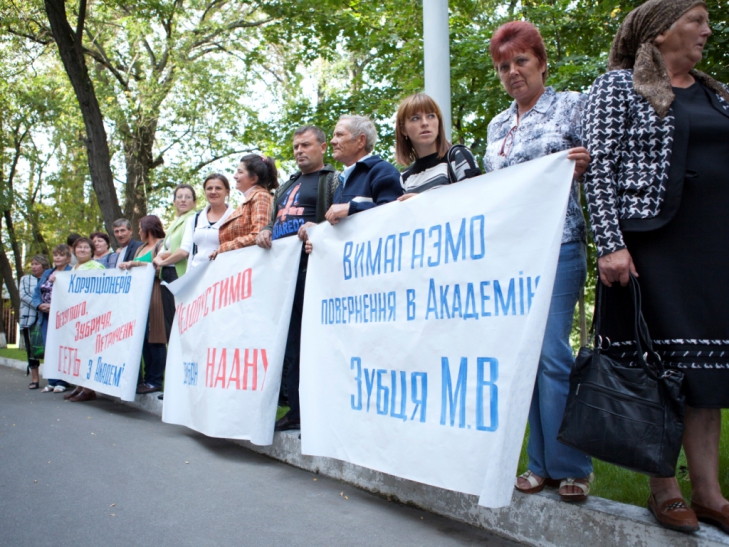 Сегодня Национальная академия аграрных наук Украины пикетировали крестьяне из Херсонской, Харьковской и Николаевской областей. Они требовали остановить дерибан государственной земли и хозяйств, который происходит по прямому указанию и в личных интересах президента НААН Николая Безуглого.