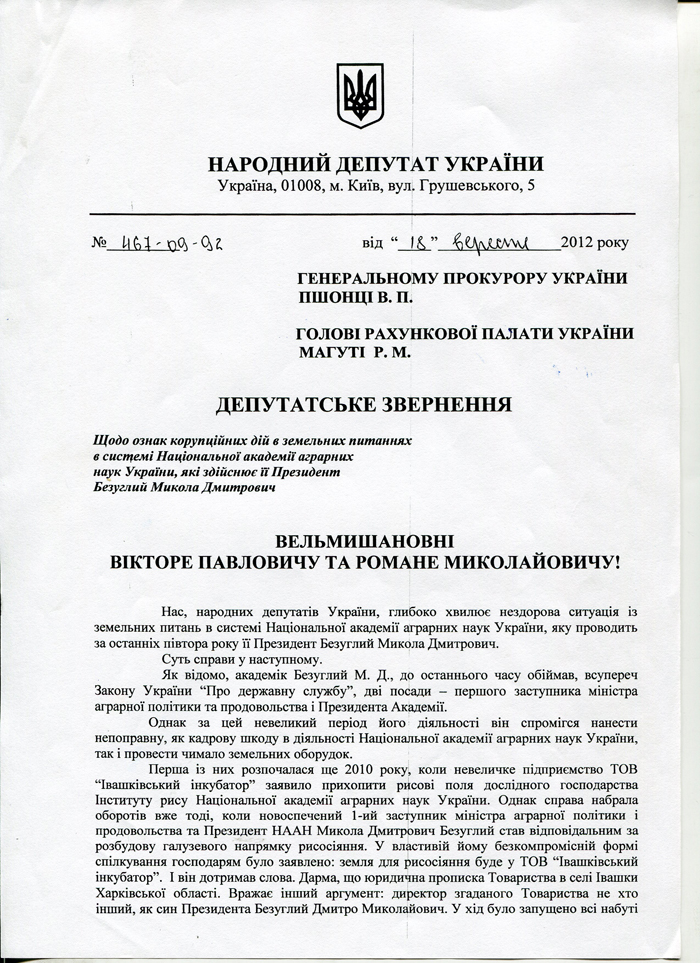 В своем обращении парламентарии выразили обеспокоенность нездоровой ситуации по разбазариванию земель Национальной академии аграрных наук Украины с помощью различных коррупционных схем, созданных с согласия Николая Безуглого.