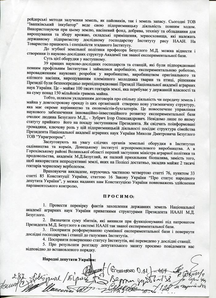 Депутаты просят генерального прокурора и председателя Счетной палаты провести проверку фактов передачи земель Национальной академии аграрных наук Украины частным структурам президента НААН Николая Безуглого. Также предлагается определить сумму убытков, нанесенных функционированием созданной Безуглым в системе Академии так называемой «экспериментальной базы», поспособствовать ее расформированию и возврату изъятого имущества и земель отраслевым институтам.