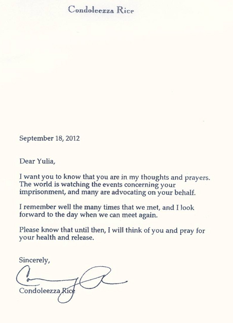 Экс-госсекретарь США Кондолиза Райс в своем письме, которое она передала Юлии Тимошенко, высказывает ей слова поддержки.