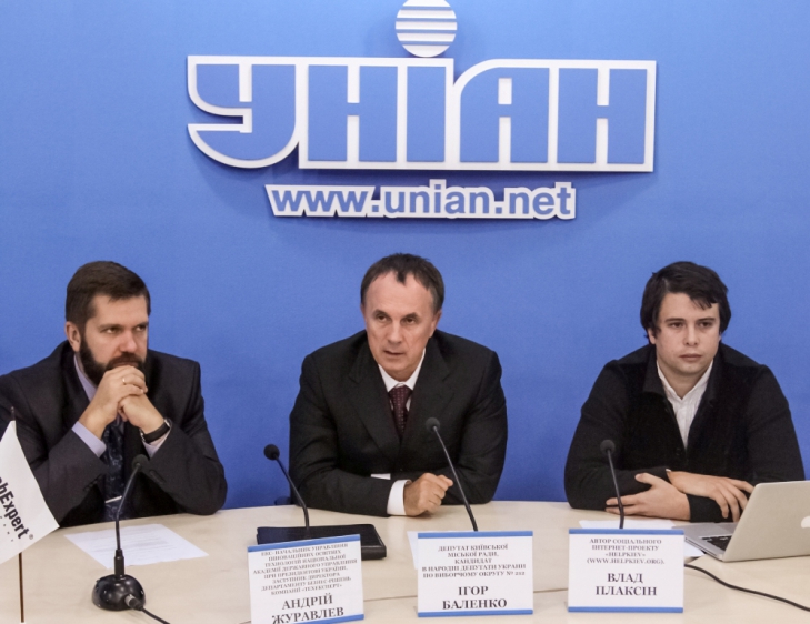 На пресс-конференции присутствовали: инициатор создания социального Интернет-проекта HELP KIEV, депутат Киевсовета Игорь Баленко, автор проекта Влад Плаксин и экс-начальник управления инновационных образовательных технологий Национальной академии государственного управления при Президенте Украины Андрей Журавлев.