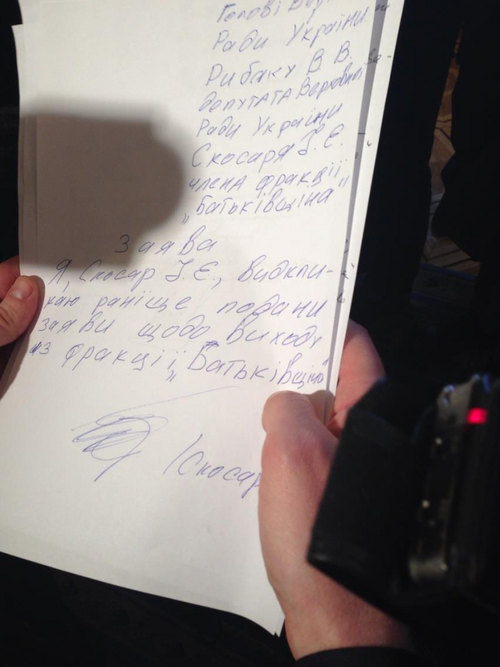 В распоряжение издания попала фотография одного из заявлений - народного депутата Игоря Скосаря. В написанном от руке документе говорится: «Я Скосарь И. Е., отзываю ранее поданное заявление относительно выхода из фракции «Батькивщина».