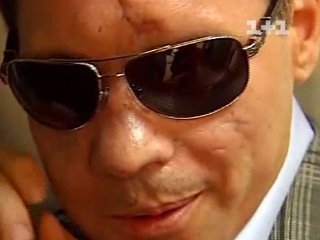 Его глаза закрыты большими солнцезащитными очками, на лице видно множество шрамов. Передвигаться ему помогают двое помощников.