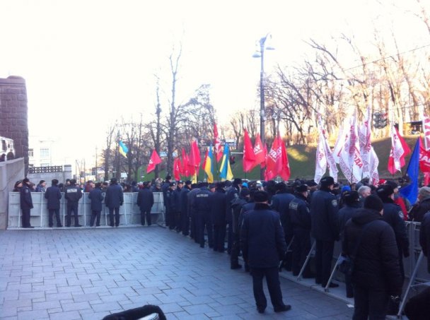 В Киеве под зданием Кабинета министров собрались более 500 активистов Евромайдана. Люди держат в руках флаги партий «Свобода», «Батькивщина» и УДАР. Несколько десятков участников акции вышли на проезжую часть и перекрыли движение на отрезке напротив центрального входа Кабмина.