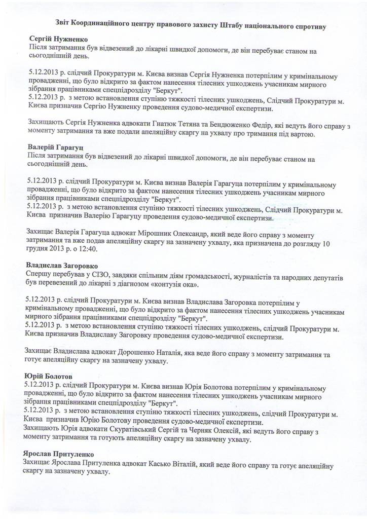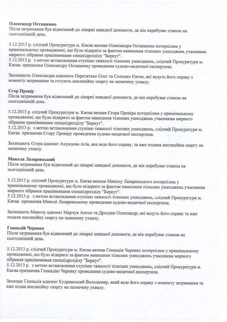 На сегодня получены многочисленные сообщения об избиениях, задержаниях и обысках. Средствами связи Центра получена информация об 11-ти случаях пострадавших в результате насильственных действий со стороны правоохранителей за 30.11-01.12.2013 года, зафиксировано 14 задержаний граждан по обвинению в совершении преступлений, предусмотренных ст.ст. 286 , 289 , 294 УК Украины. Кроме того, следует отметить, что лично к адвокатам, которые вошли в Центр защиты, обращаются знакомые, друзья с сообщениями о наличии информации о жертвах, задержаниях, провокациях и обысках.