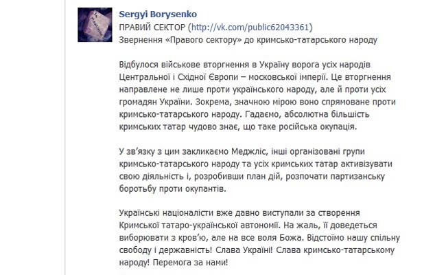 «Украинские националисты уже давно выступали за создание Крымской татаро-украинской автономии. К сожалению, за нее придется бороться с кровью, но на все воля Божья. Отстоим нашу общую свободу и государственность! Слава Украине! Слава крымскотатарскому народу! Победа за нами!», - отметили в Правом секторе, не уточняя, что именно они имеют в виду под борьбой.