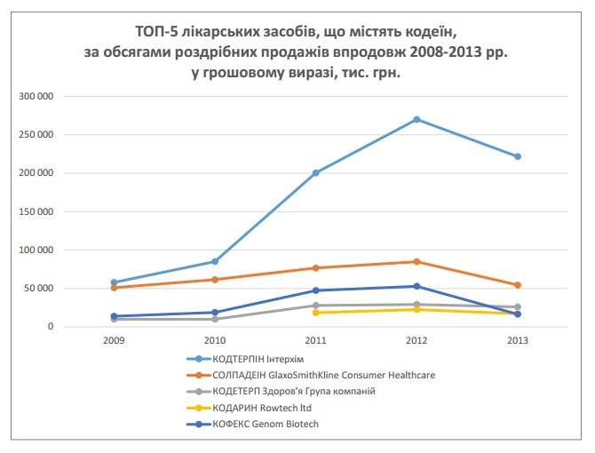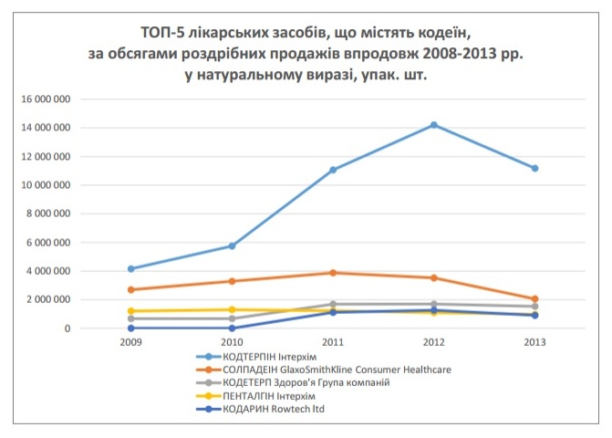 Установлено, что в топ-5 самых продаваемых препаратов на основе этого вещества входят ««Пенталгин» (ОДО "ИнтерХим"), «Солпадеин» (GlaxoSmithKline Consumer Healthcare), «Кодтерпин» (ОДО "ИнтерХим"), «Кодетерп» (ООО "ХФП "Здоровье народу") и «Кодарин» (Vivimed Labs Ltd для ROWTECH LTD). Причем розничная продажа «Кодтерпина» (ОДО "ИнтерХим") растет бешеными темпами. Если в 2009 году было продано в розницу 4 млн. упаковок, то в 2012-м – 14 млн. Это и не удивительно – цена одной упаковки препарата на 10 таблеток в Украине составляет около 25 грн.