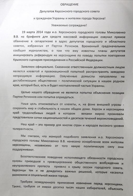 19 марта 2014 года в.и.о. херсонского городского головы Миколаенко В.В. на брифинге для средств массовой информации озвучил прямое обвинение в сепаратизме в адрес депутатов городского и областного советов, избранных от Партии Регионов.