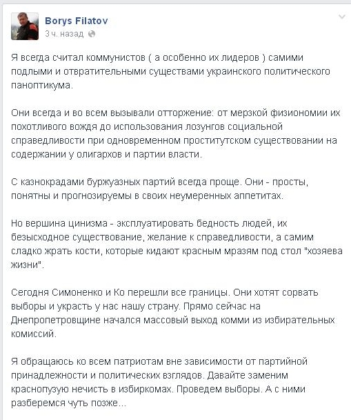 "Сегодня Симоненко (лидер КПУ, - ред.) и Ко перешли все границы. Они хотят сорвать выборы и украсть у нас нашу страну. Прямо сейчас на Днепропетровщине начался массовый выход коммунистов из избирательных комиссий" , - написал он.