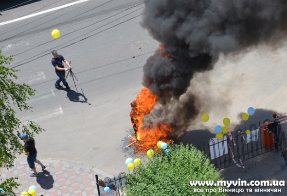 Как сообщает Газета.уа, с восьми утра 10 июня активисты, среди которых также были люди из "Дорожного контроля", "Демократического альянса" и "Правого сектора" окружили здание админсудов на улице Островского, розвесив по забору плакаты с призывами к увольнению Виталия Кузьмишина, нацепили желто-голубые шарики, включили музыку и прикатили шины к лестнице. Перед входом на территорию учреждения активисты поставили также манекен, одетый в судейскую мантию, из карманов которого торчали одно-двухгривневые купюры - как символ взяточничества судебной системы Украины.