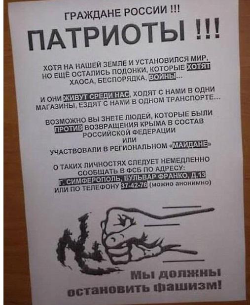 Жителей Крыма призывают сообщать об украинских патриотах в ФСБ. Именно с таким содержанием раздают листовки в Симферополе. Фотографию листовки разместили в издании «Крым.Реалии».