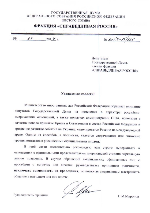 Лидер партии и фракции в Госдуме «Справедливая Россия» Сергей Миронов запретил своим депутатам встречаться с американцами. Об этом сообщил депутат Госдумы, член фракции «Справедливая Россия» Дмитрий Гудков в ЖЖ.